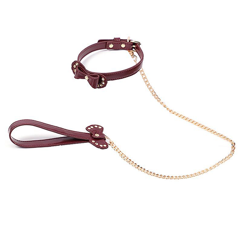 Coleira bondage com guia em corrente ajustável por meio de fivelas metálicas, confeccionada em couro sintético,