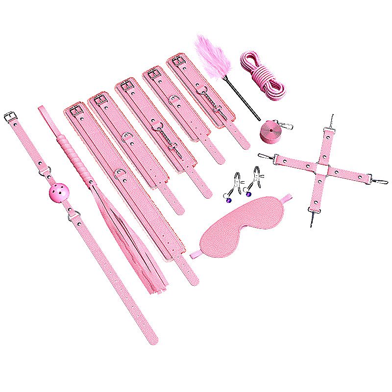 kit sado composto por venda, mordaça, algema, tornozeleira, coleira, guia, chicote e corda, prentedor de Mamilo, pena estimuladora.