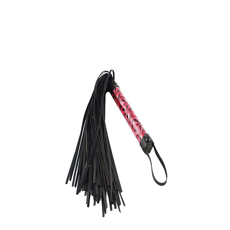 Chicote estilo flogger com tiras em couro sintético e cabo rígido que permite golpes e chicotadas rápidas e precisas.