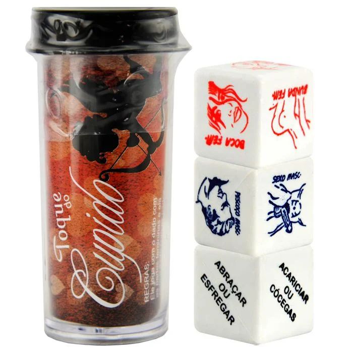 Jogo Dados Toque do Cupido. Ele joga com o dado as partes femininas e ela com o dado com as partes masculinas, alternadamente junto com o dado de tarefas. Dadinho embalado em exclusiva caixinha em acrílico.