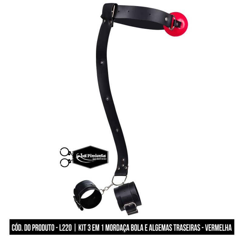 O kit contém uma Mordaça Bola com Algema Traseira. A mordaça é confeccionada em material sintético emborrachado e flexível. E o acessório com material sintético semelhante a couro com revestimento interno aveludado. Possui ajuste e regulagem para se adequar melhor ao corpo e garantir conforto. Detalhe de fivelas, fechos e travas em metal niquelado. Surpreenda seu parceiro e domine seu parceiro com estilo!