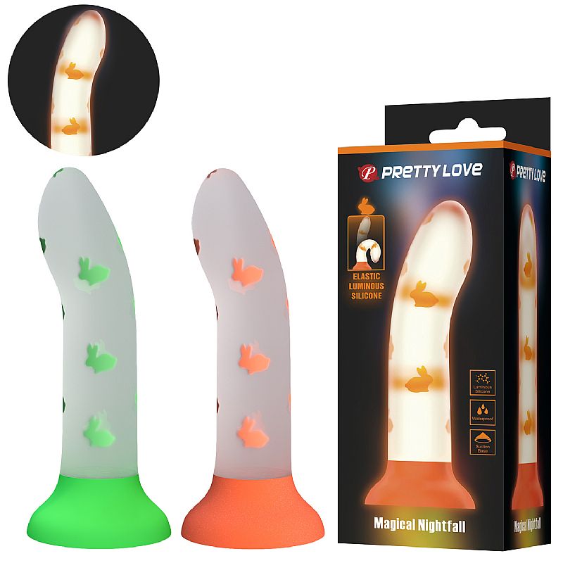 Dildo com ventosa, Luminoso no escuro, confeccionado em silicone, possui um formato para penetrações em ângulo reto
